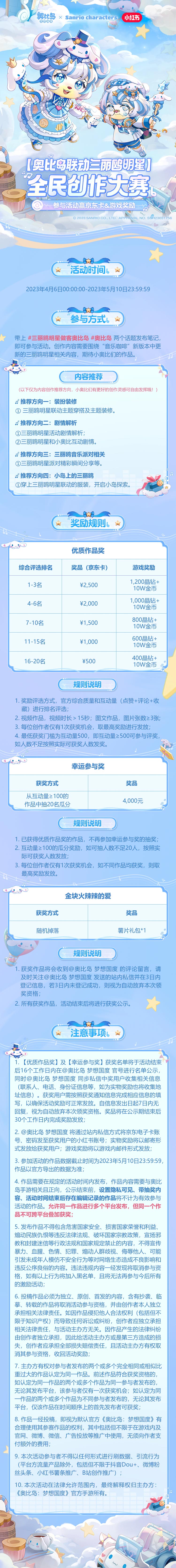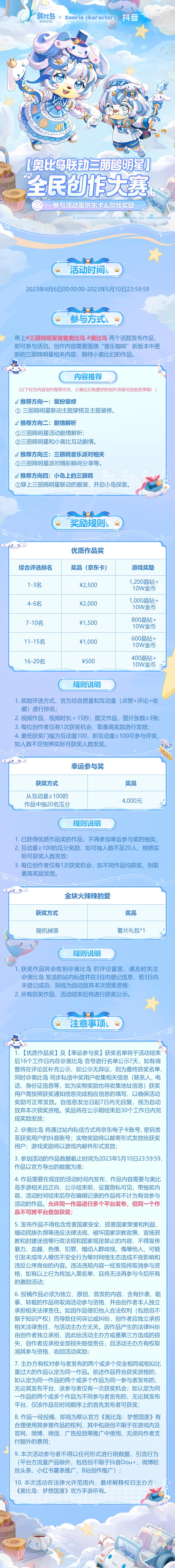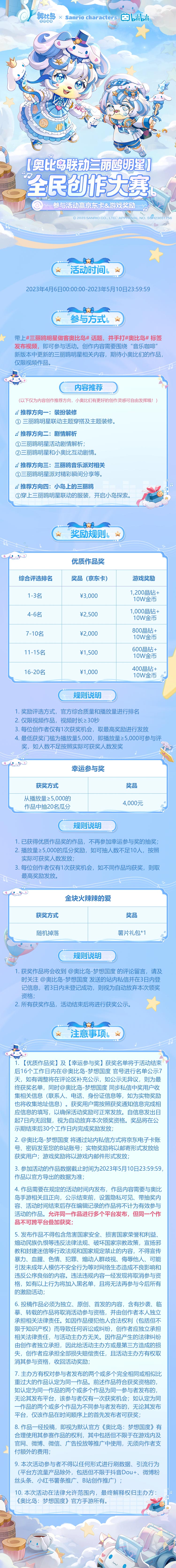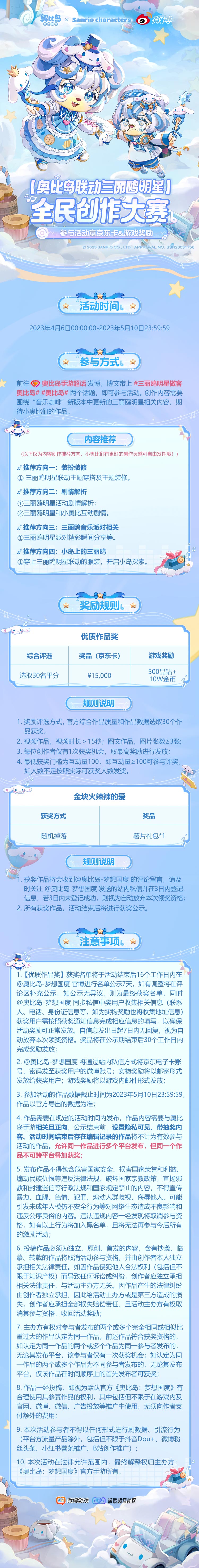 本次「奥比岛联动三丽鸥明星」全民创作大赛将在微博、小红书、抖音、B站四个平台同步开启,均为小奥比们备下了丰厚的奖励,各平台具体参与规则请戳下方长图 ↓