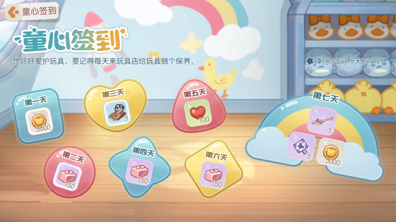 活动介绍:想好好爱护玩具,要记得每天来玩具店给玩具做个保养哦!活动期间内参与签到即可领取奖励,累计签到还能获得「童趣积木」「高级宠物笛」和「晶钻服装彩蛋锤」等稀有奖励!