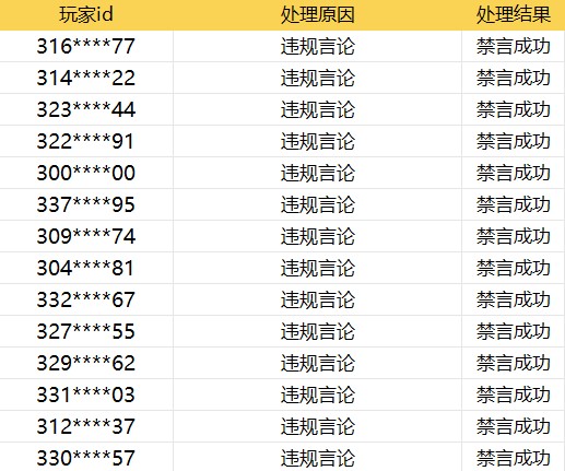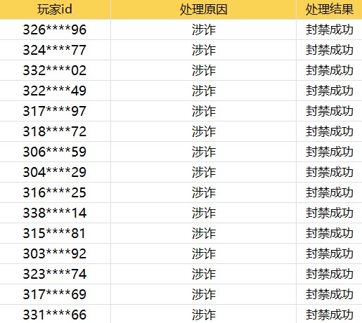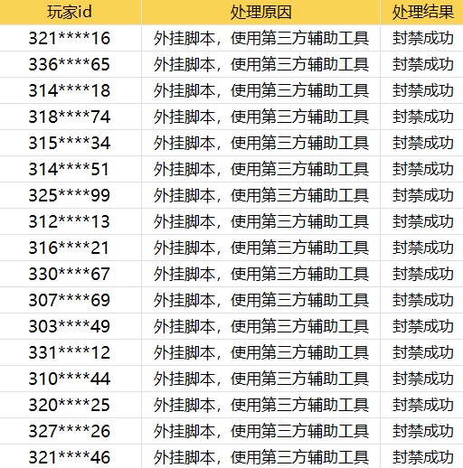 一、针对使用外挂辅助者/工作室性质账号,我们已经进行警告/限时/永久封停处理,共计处理58975个账号,部分名单如下: