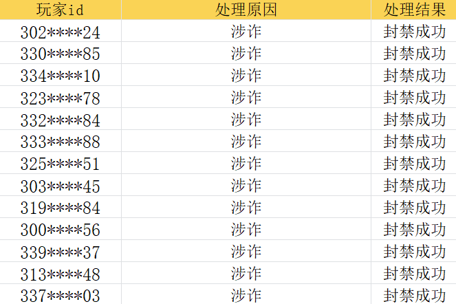 一、针对使用外挂辅助者/工作室性质账号,我们已经进行警告/限时/永久封停处理,共计处理68807个账号,部分名单如下: