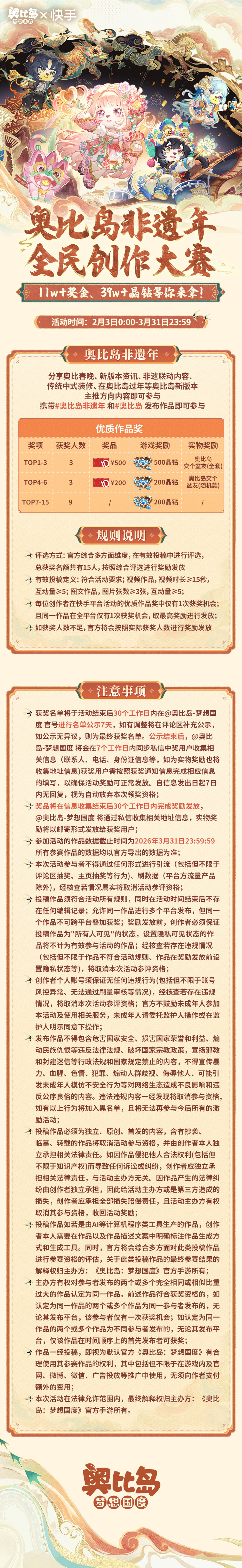 本次「奥比岛非遗年」全民创作大赛将在快手、小红书、抖音三个平台同步开启,各平台具体参与规则请戳下方长图