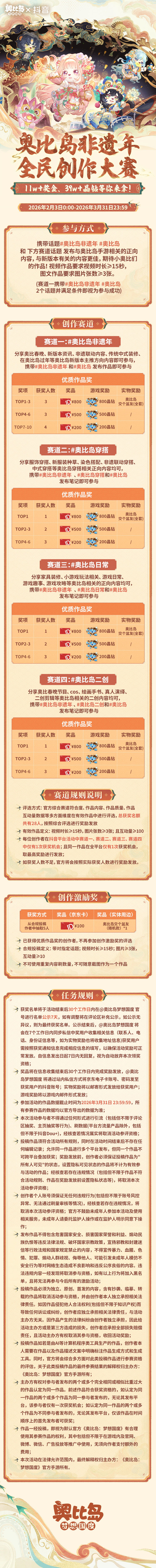 「奥比岛非遗年」全民创作大赛开启!带活动话题发布作品,即有机会参与瓜分10w 奖金和超多晶钻等丰厚福利!小红书搜索【奥比岛】进入活动还可参与抽奖赢大礼~